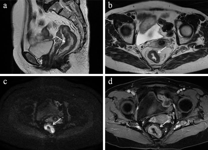 图1 直肠癌 a, b. T2WI,直肠肠壁明显不规则增厚,肌层信号不连续,外缘欠光整;c. DWI呈高信号;d. 增强扫描病变明显不均匀强化。