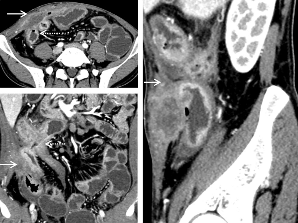 图1 克罗恩病并发脓肿 A:轴位示右前腹一梭形包块(实箭),内部为液性密度,呈环壁强化,邻近小肠肠壁增厚(虚箭);B:冠状位CT检查示脓肿(实箭)与腹壁粘连,同时合并右腹小肠肠间瘘(虚箭)形成,肠管似“花瓣”样改变,腹腔多段小肠系膜侧增厚、强化;C:矢状位CT检查示脓肿周围炎性渗出明显(实箭),局部脂肪间隙消失